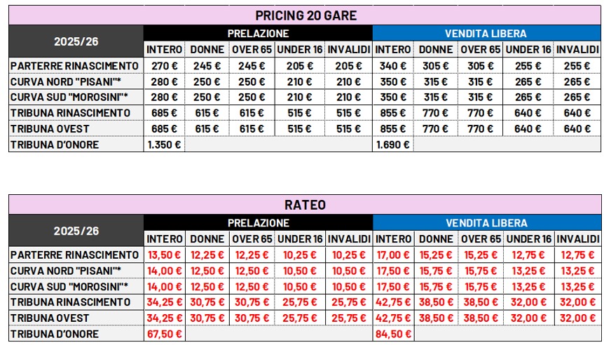 Il tetto massimo degli abbonamenti sarà quello della scorsa stagione sportiva, cioè 15.300 abbonati, in considerazione di 1.500 posti per i tifosi ospiti, 2.000 alla vendita corporate. Dal 2 luglio dalle 10 alle 14 e dalle 16 alle 19, stessa location dello scorso anno, sotto la Curva Nord, inizierà la vendita in prelazione. Ci sarà anche un servizio ulteriore per i disabili, aprendo i ticketing point, esclusivamente riservato. La prelazione terminerà il 10 di luglio, quindi la vendita libera.