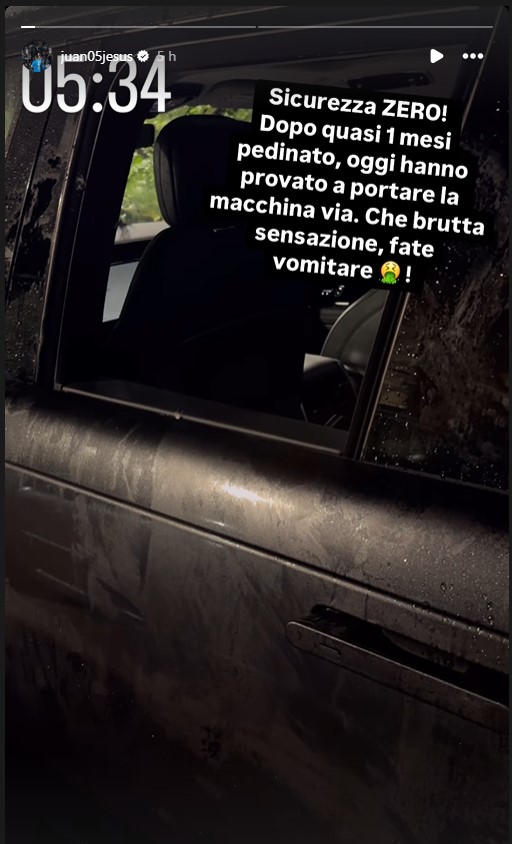 Nella notte Juan Jesus ha subito un tentativo di furto della sua auto e, dopo il pessimo risveglio, ha sfogato tutta la sua rabbia con una storia pubblicata su Instagram alle 5:34 del mattino. Questo il messaggio contenuto: “Sicurezza ZERO! Dopo quasi un mese di pedinamento, oggi hanno provato a portar via la mia macchina. Che brutta sensazione. Fate vomitare!”.